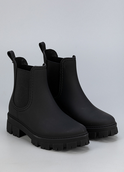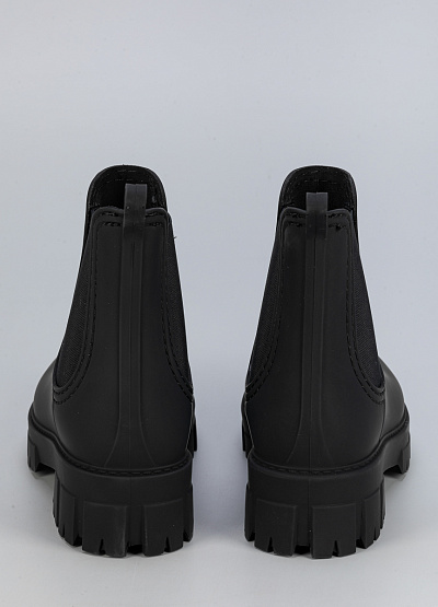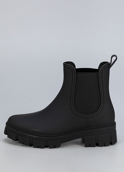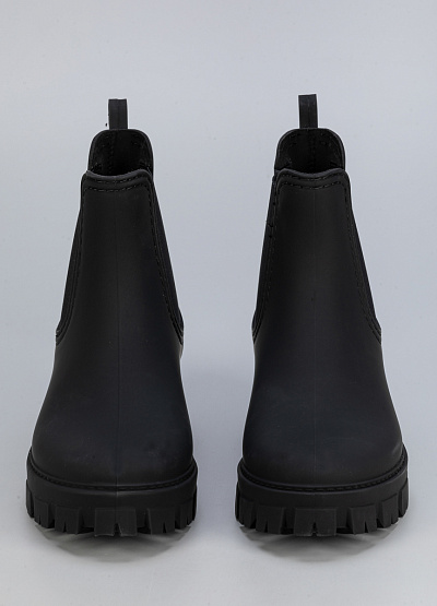 Женские черные резиновые ботинки челси – универсальная и стильная модель для дождливой погоды. Матовая поверхность придает обуви лаконичный и современный вид, а массивная подошва с рельефным протектором обеспечивает отличное сцепление с поверхностью. Эластичные боковые вставки и петля на заднике облегчают процесс надевания.