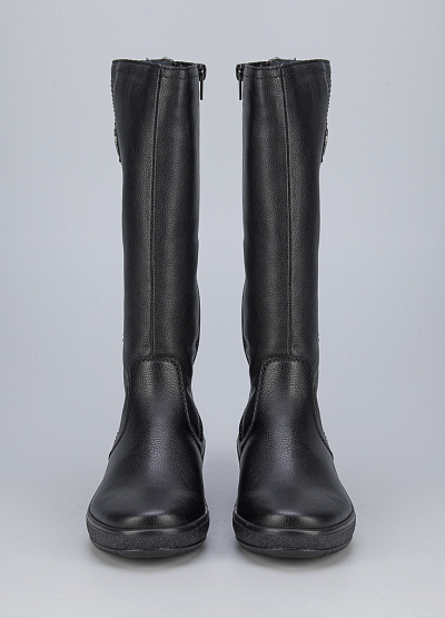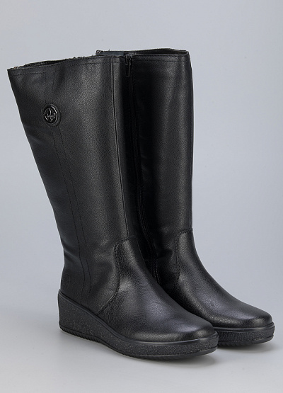 • Женские сапоги из натуральной кожи и экокожи от бренда Rieker. Закругленный носок. Замок на молнии сбоку и сзади. Логотип сбоку. Плоская подошва с небольшим подъемом.