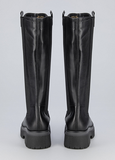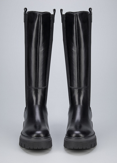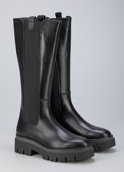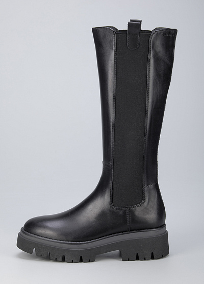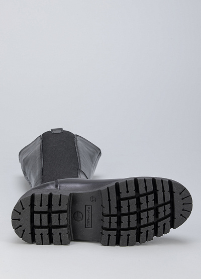 • Женские сапоги из натуральной кожи от бренда Tamaris. Модель с эластичными вставками по бокам. Закругленный носок. Петли для подтягивания по бокам. Массивная рифленая подошва на низком каблуке.