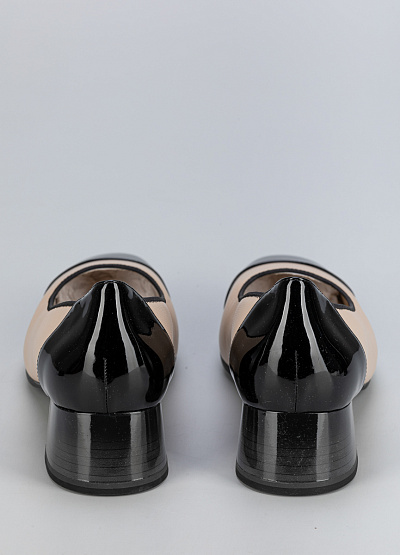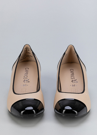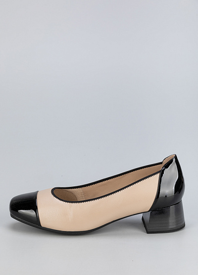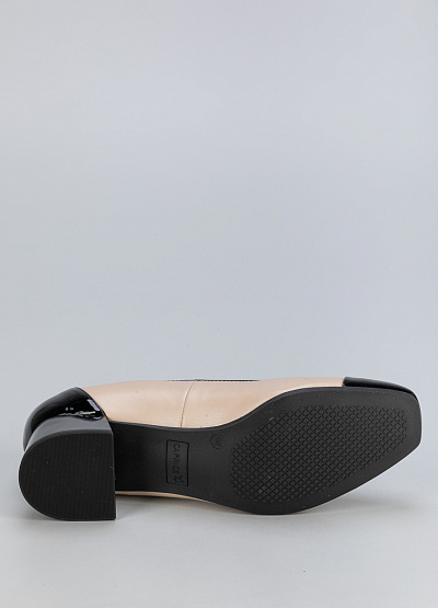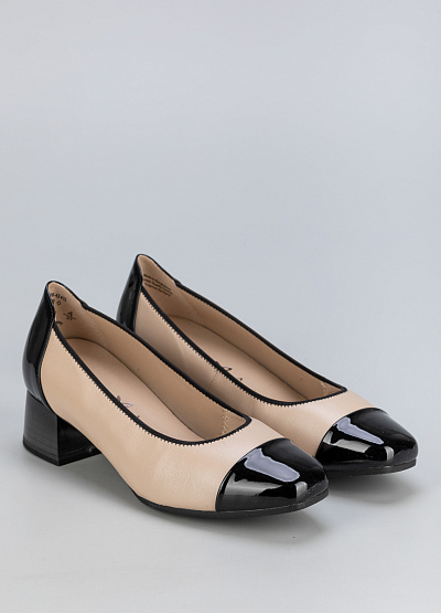 • Элегантные женские туфли бежевого цвета с лакированными черными вставками – стильная модель, которая гармонично сочетает классику и современные тренды. Контрастное сочетание цветов придает обуви изысканный вид, а устойчивый каблук обеспечивает комфорт при ходьбе. Такой дизайн делает туфли универсальными для делового, вечернего и повседневного гардероба.