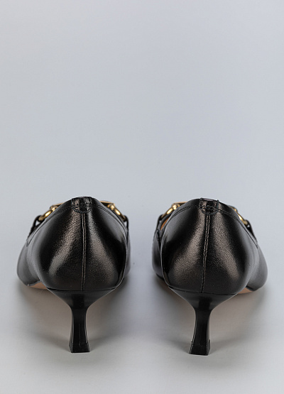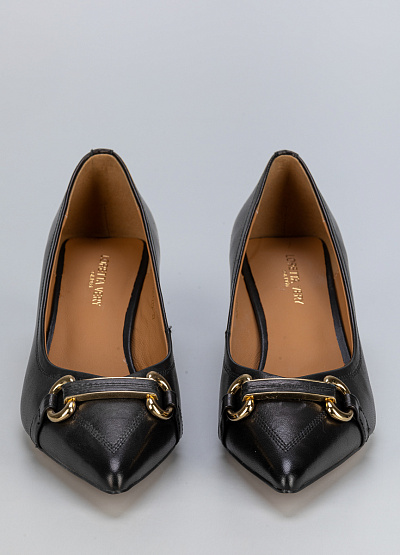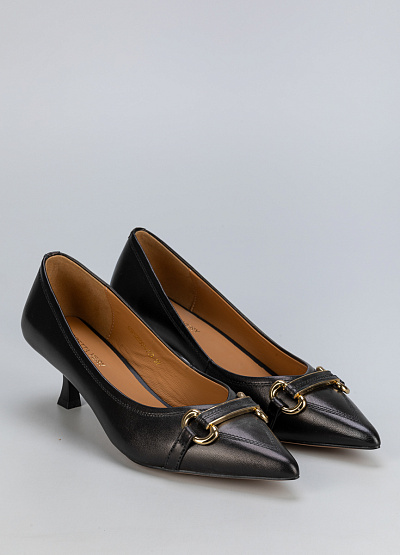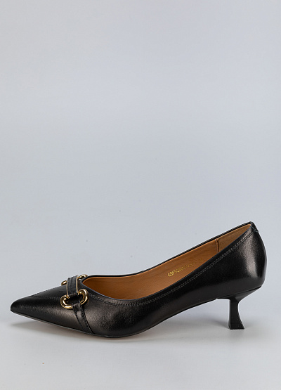 • Элегантные черные женские туфли в классическом стиле – воплощение утонченного вкуса. Заостренный носок придает модели изящный силуэт, а аккуратный невысокий каблук делает шаг легким и уверенным. Декоративная золотистая фурнитура добавляет благородный акцент, создавая гармоничный образ. Эта пара идеально подойдет для делового гардероба, торжественных мероприятий и стильных повседневных образов.