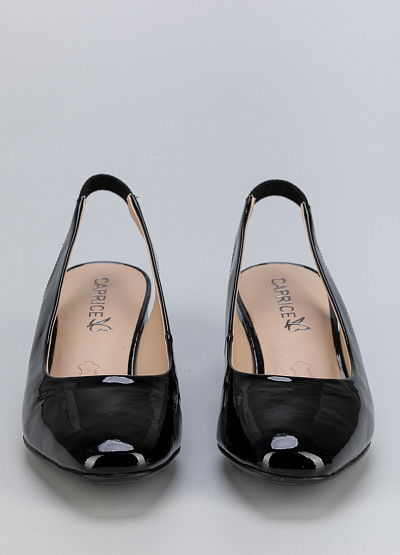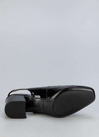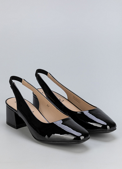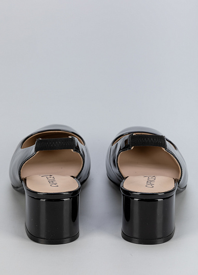 • Женские черные лаковые туфли из натуральной кожи с открытой пяткой – элегантная и стильная модель для особых случаев и повседневного гардероба. Гладкая лакированная поверхность придает обуви изысканный блеск, а удобный устойчивый каблук обеспечивает комфорт при ходьбе. Ремешок с эластичной вставкой гарантирует надежную фиксацию на ноге.