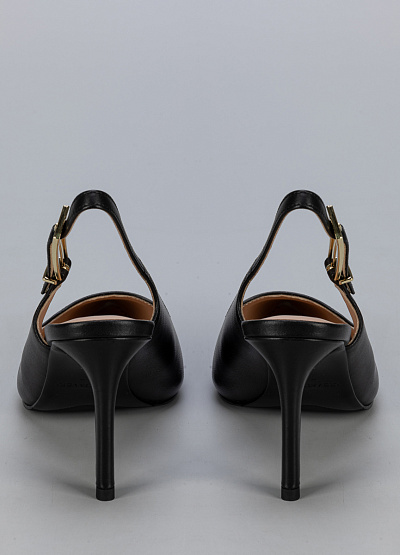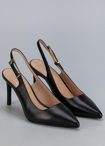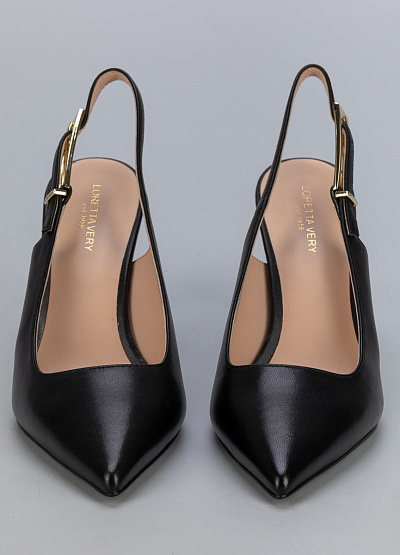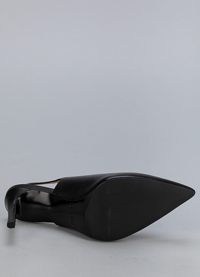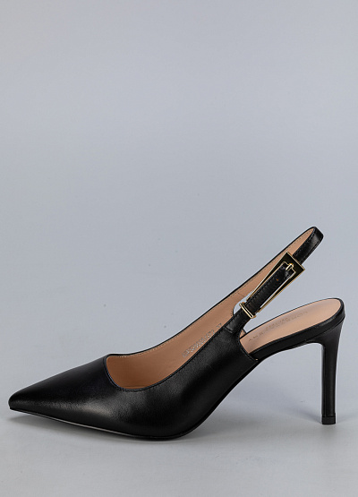 • Элегантные черные туфли-лодочки из натуральной кожи с открытой пяткой – стильный и универсальный вариант для любого гардероба. Зауженный носок и высокий каблук создают изящный силуэт, а регулируемый ремешок с металлической пряжкой обеспечивает комфортную посадку.