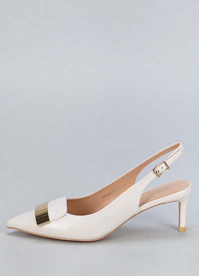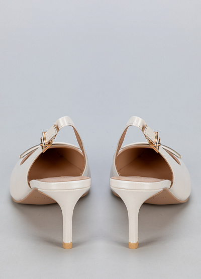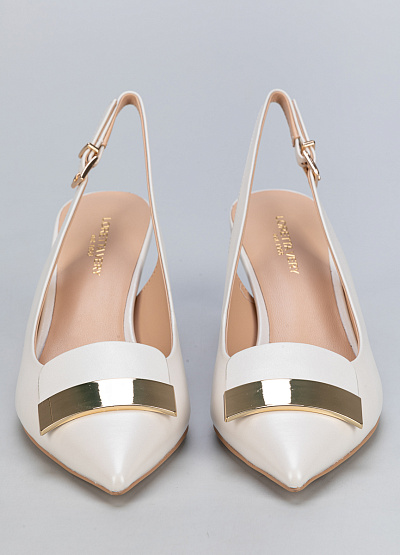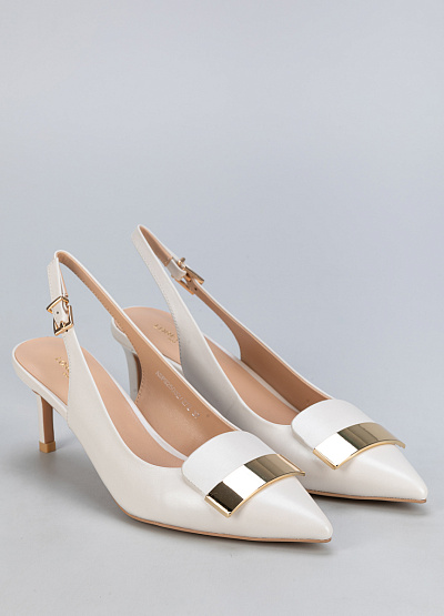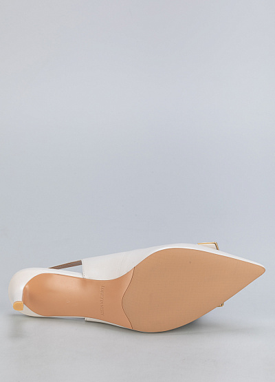 • Эти элегантные туфли-лодочки на среднем каблуке из натуральной кожи – идеальное сочетание роскоши и удобства. Выполненные в универсальном белом цвете, они подойдут для особых случаев, делового стиля и повседневной носки. Золотая декоративная деталь на мыске добавляет модели нотку изысканности.