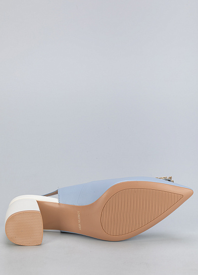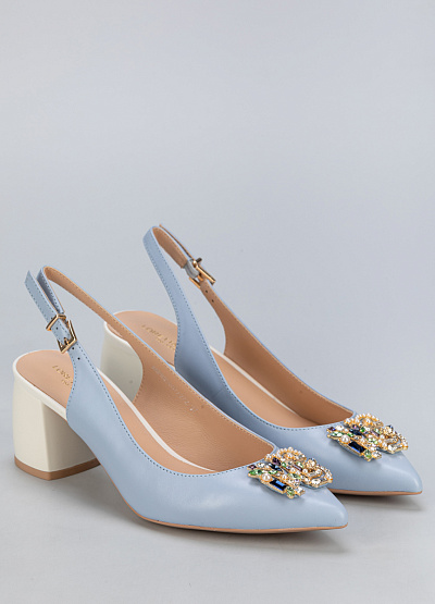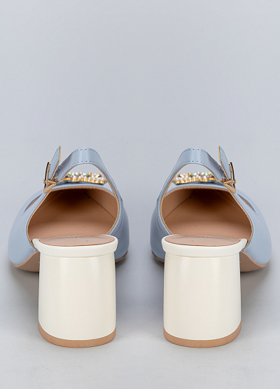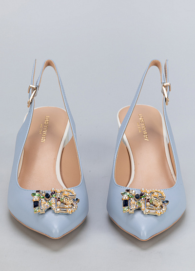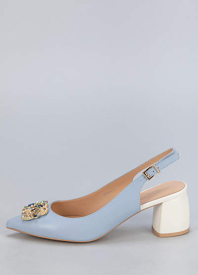 • Элегантные туфли-лодочки из натуральной кожи в нежном голубом оттенке с открытой пяткой – воплощение женственности и утонченного стиля. Изюминкой модели является роскошная брошь, украшенная стразами и бусинами, которая придает обуви особый шарм.
