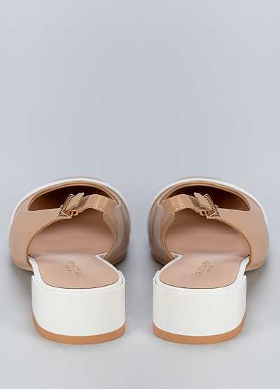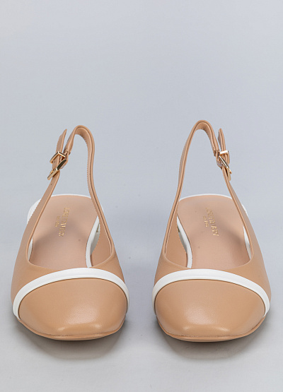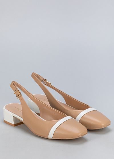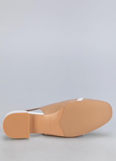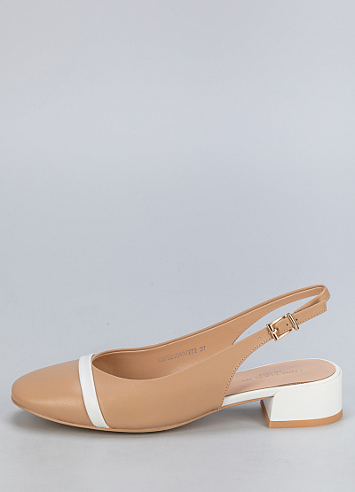 • Элегантные и универсальные туфли-лодочки из натуральной кожи в нежном бежевом оттенке с открытой пяткой – идеальный вариант для стильного повседневного или делового образа. Белая декоративная вставка на носке и контрастный каблук придают обуви современный и элегантный вид.