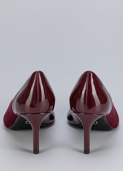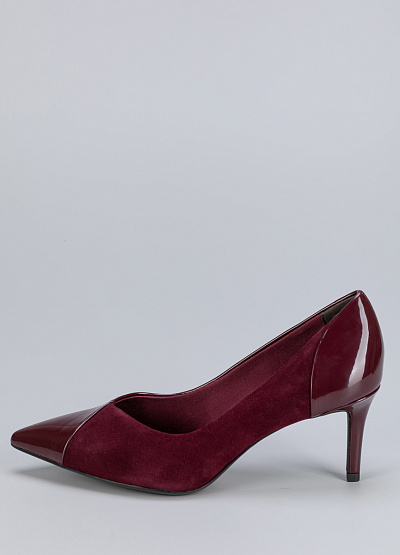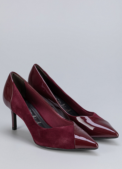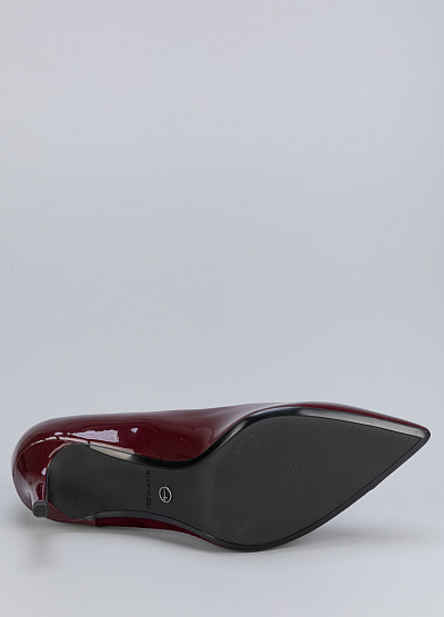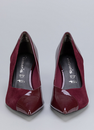 • Женские туфли бордового цвета из натуральной кожи и экокожи от бренда Tamaris. Они выполнены в классическом стиле лодочек с острым носом и низким каблуком, который придает им изящный вид.