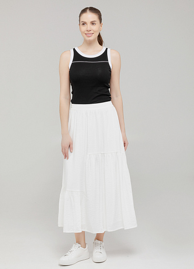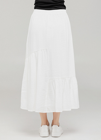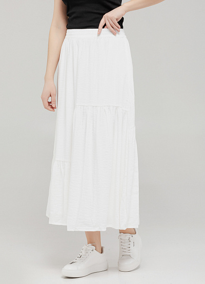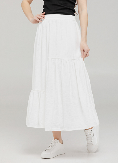 • Женская белая юбка миди с ярусами — свежий и воздушный элемент летнего гардероба. Благодаря свободному крою и мягкой резинке на поясе она обеспечивает комфорт и лёгкость в движениях.