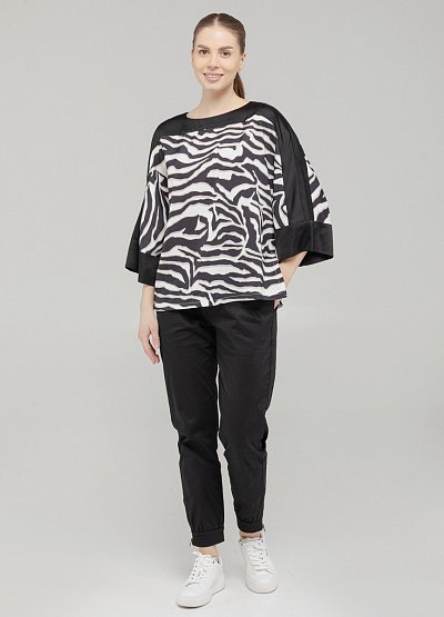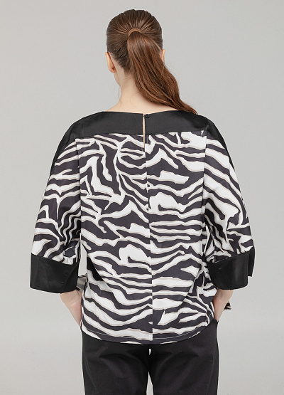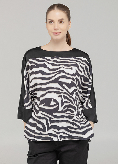 • Женская блузка с принтом — эффектная и комфортная модель для тех, кто ценит стиль и свободу движения. Чёрно-белая палитра делает образ выразительным и универсальным.