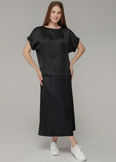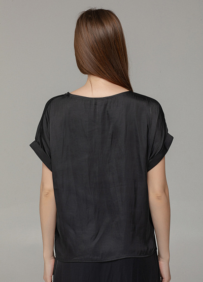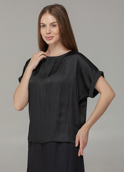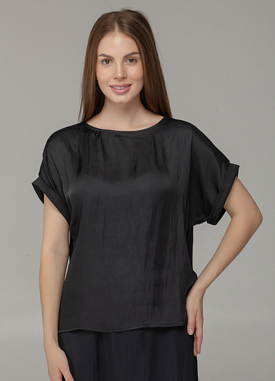 • Женская блуза свободного кроя в насыщенном чёрном цвете — идеальный выбор для элегантных и расслабленных образов. Лёгкий блеск ткани создаёт эффект благородного шёлка, а рукава с подворотом добавляют изюминку.