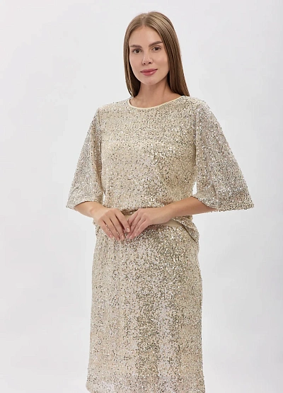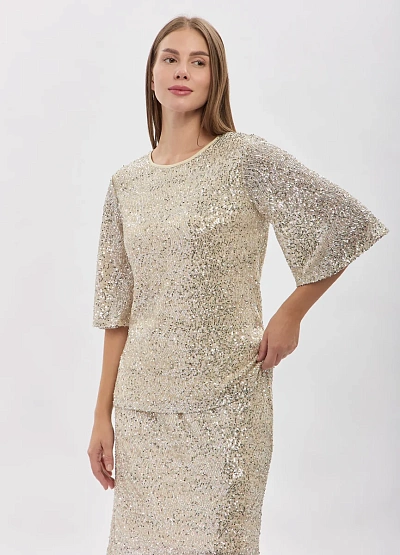 • Эффектная блуза  создана для особых случаев и ярких образов. Модель полностью декорирована плотными сияющими пайетками, которые красиво отражают свет и придают лукам праздничное настроение. Свободный крой обеспечивает комфорт, а полупрозрачные рукава добавляют легкости и изящества, создавая баланс между блеском и утонченностью. Эта блуза станет выразительным акцентом в гардеробе для вечеринок, мероприятий и стильных выходов.