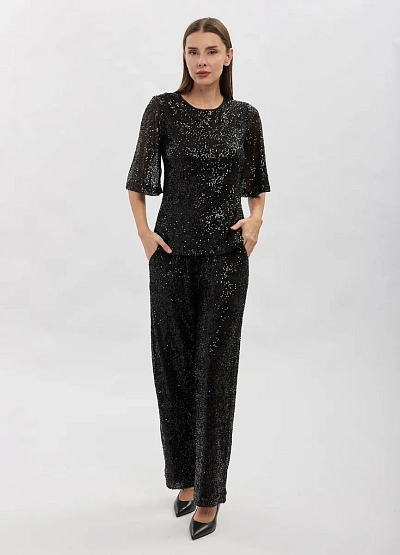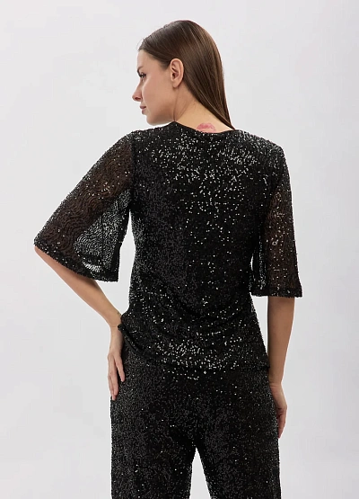 • Элегантный женский топ с пайетками создан для выразительных вечерних образов. Модель выполнена в прямом силуэте, который аккуратно подчёркивает фигуру и обеспечивает комфортную посадку. Полупрозрачные рукава длиной до локтя добавляют образу утончённости и визуальной лёгкости, а лаконичный округлый вырез делает топ универсальным для сочетаний с брюками и юбками. Мерцающая фактура пайеток эффектно играет при освещении, придавая образу праздничный и изысканный характер.