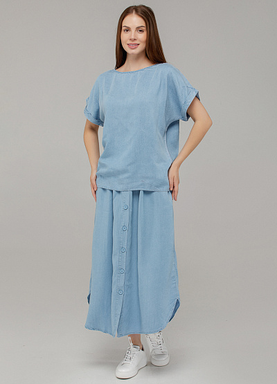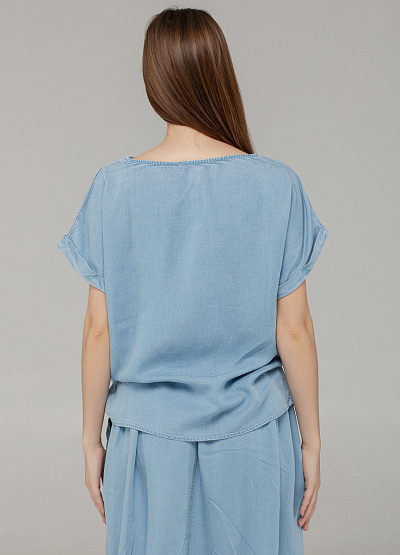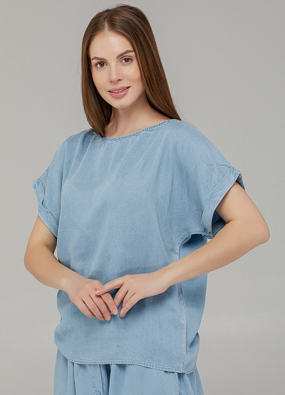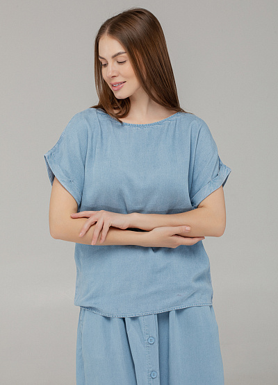 • Свободная женская рубашка в светло-голубом оттенке из мягкого денима — универсальный элемент базового гардероба. Небрежно подвернутые рукава и легкая ткань придают образу расслабленную лёгкость и комфорт.