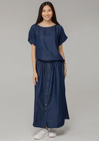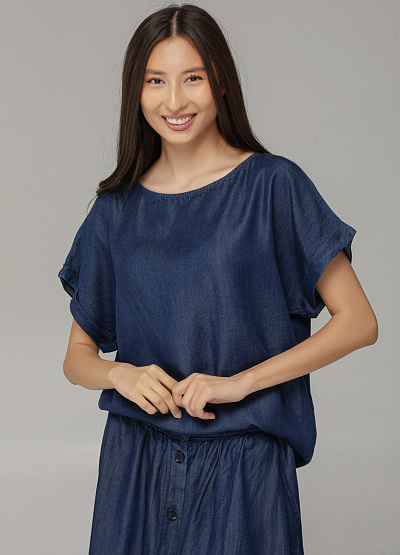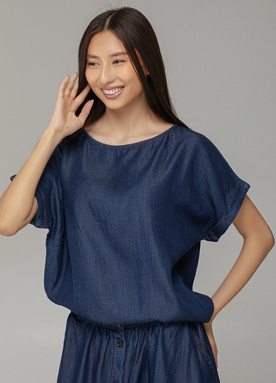 • Свободная женская рубашка в синем оттенке из мягкого денима — универсальный элемент базового гардероба. Небрежно подвернутые рукава и легкая ткань придают образу расслабленную лёгкость и комфорт.