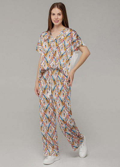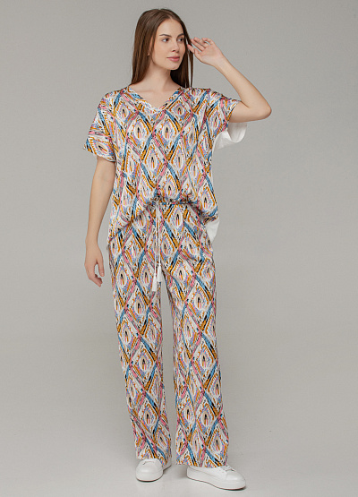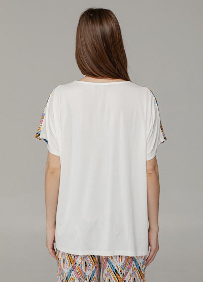• Женский топ с этническим принтом — лёгкий акцент в летнем гардеробе. Модель выполнена из струящейся ткани с декоративным V-образным вырезом и свободным кроем, который не сковывает движений. Контрастные однотонные вставки по бокам добавляют силуэту выразительности и визуально стройнят.
