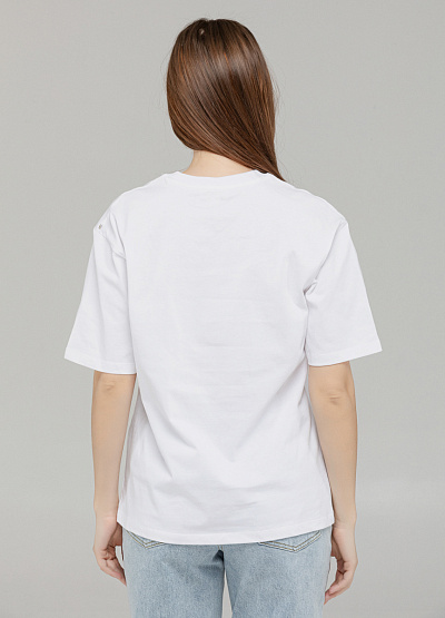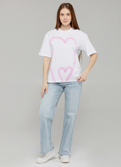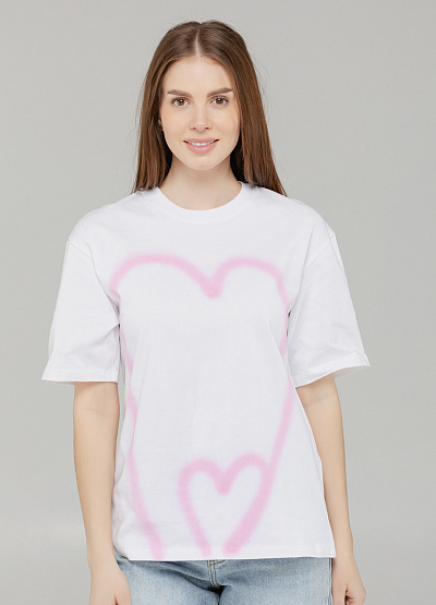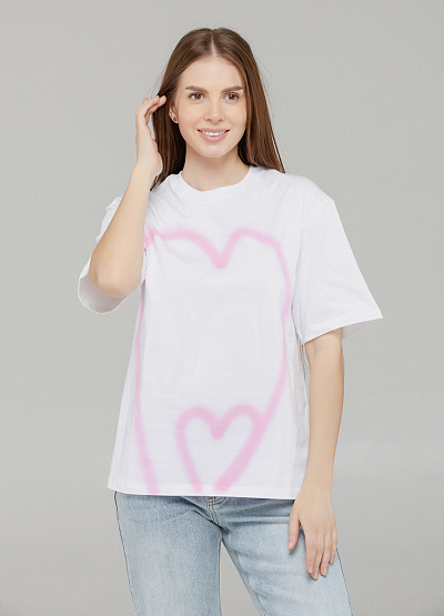 • Стильная женская футболка свободного кроя выполнена из мягкого хлопкового трикотажа. Белый цвет делает модель универсальной, а акцентный розовый принт в форме сердца добавляет образу игривости и романтичного настроения. Идеально подходит для повседневной носки, прогулок, встреч с друзьями или городских образов в стиле casual. Лаконичный круглый вырез, короткие рукава и комфортная посадка обеспечивают свободу движений и удобство в течение всего дня.