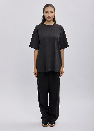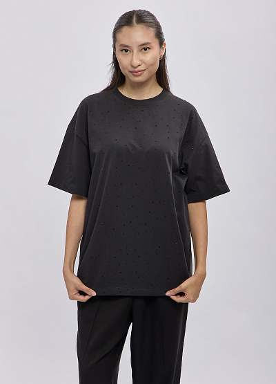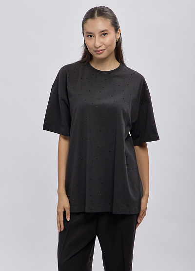 • Женская oversize-футболка Thomas Graf в чёрном цвете с аккуратным россыпным декором — стильная и комфортная модель, которая станет ярким акцентом повседневного образа. Свободный крой не сковывает движения, а мягкий хлопковый трикотаж обеспечивает удобство в течение всего дня. Миниатюрные блестящие элементы создают лёгкое сияние, делая базовую вещь более выразительной и современной. Отличный выбор для тех, кто любит сочетать простоту и трендовые детали.