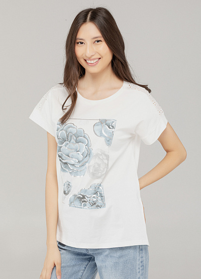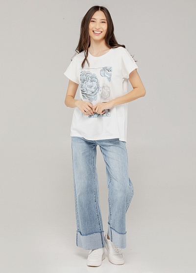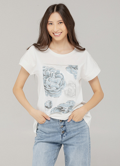 • Женская футболка — это сочетание женственности и повседневного стиля. Нежный цветочный принт в пастельных тонах смотрится элегантно и свежо, подчёркивая вкус и утонченность. Идеальна для летнего гардероба и стильно дополнит любой образ.