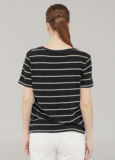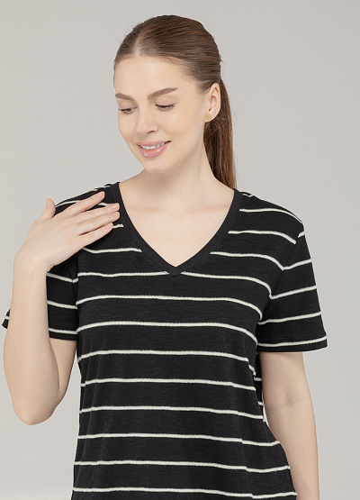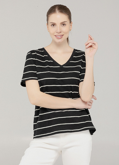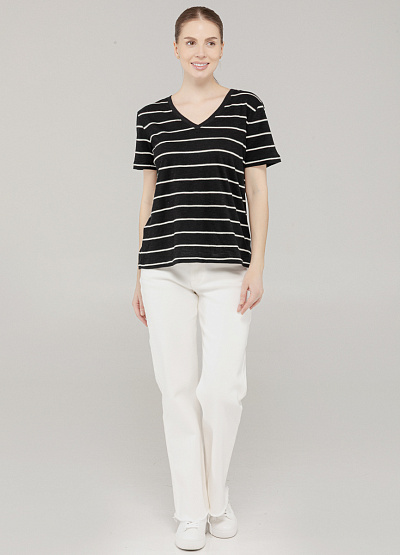 • Эта базовая футболка — воплощение комфорта и универсального стиля. Выполненная из мягкого трикотажа с натуральной текстурой, она идеально сидит по фигуре и подойдёт для любого случая: от прогулок по городу до расслабленного офиса. Контрастные горизонтальные полоски в светлом оттенке придают образу динамику, а V-образный вырез визуально удлиняет шею и делает силуэт более изящным. Прямой крой обеспечивает свободу движений и легко сочетается с любой посадкой низа.