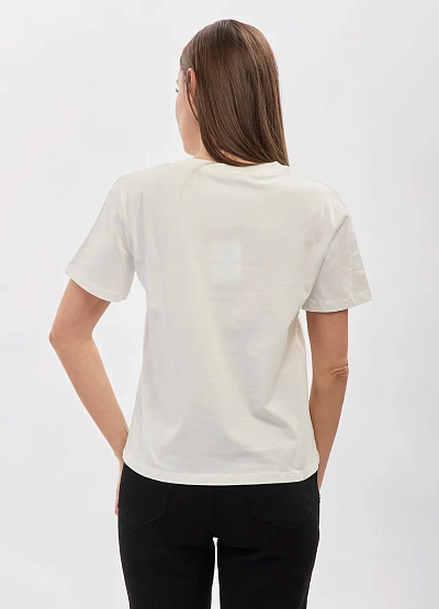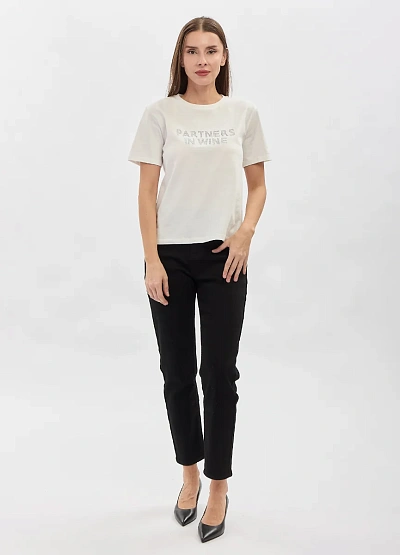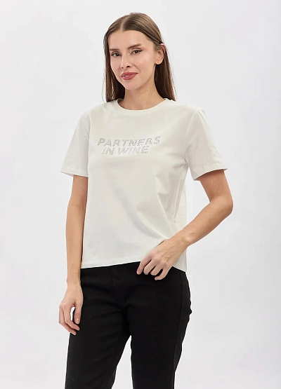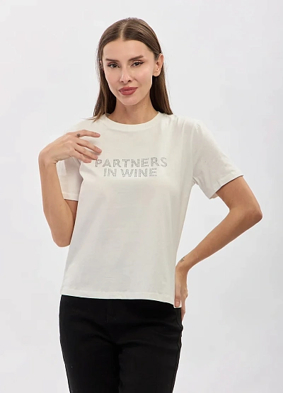 • Женская футболка выполнена в лаконичном белом цвете и украшена аккуратным текстовым принтом «PARTNERS IN WINE», выложенным декоративными элементами. Классический прямой крой и округлый вырез делают модель универсальной и комфортной для повседневной носки. Футболка легко вписывается в базовый гардероб, сочетаясь как с брюками и джинсами, так и с юбками. Мягкий трикотаж приятен к телу и подходит для длительного ношения.