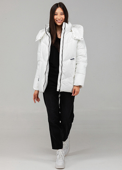 • Женская куртка от бренда Alinlone. Модель прямого кроя. Застежка на молнии. Капюшон. Два кармана по бокам. Логотип сбоку.