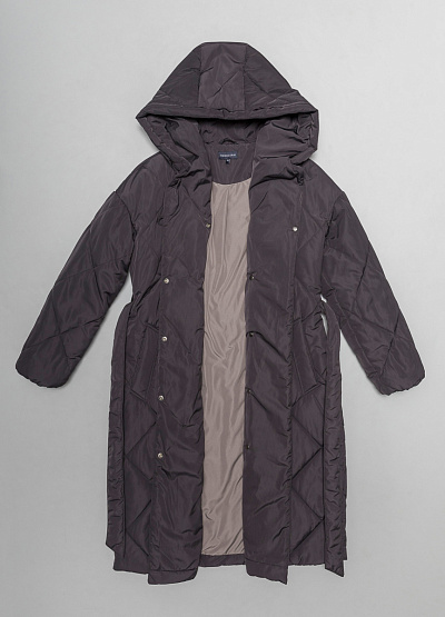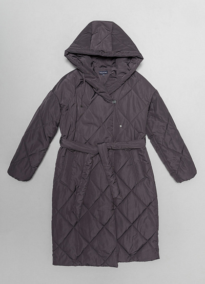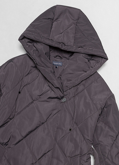 • Женская стеганая куртка от немецкого бренда Thomas Graf. Модель прямого кроя с капюшоном. Застежка на кнопках. Два прорезных кармана. Пояс в тон.