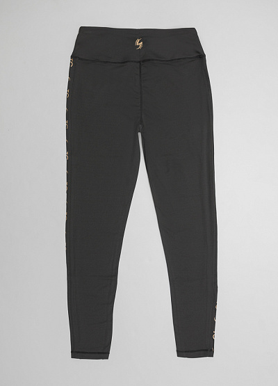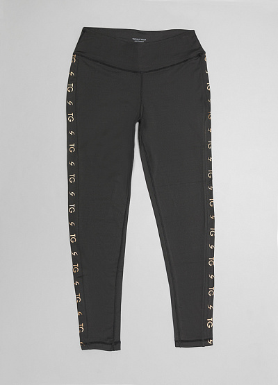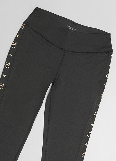 • Женские спортивные леггинсы черного цвета от немецкого бренда Thomas Graf. Прилегающий крой. Эластичный пояс. Контрастные вставки по бокам в виде логотипа бренда в золотом цвете.