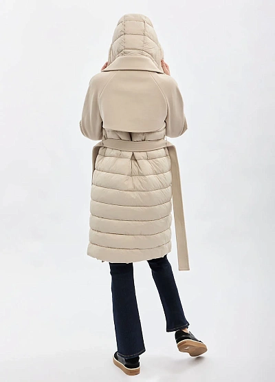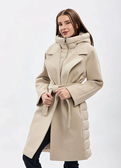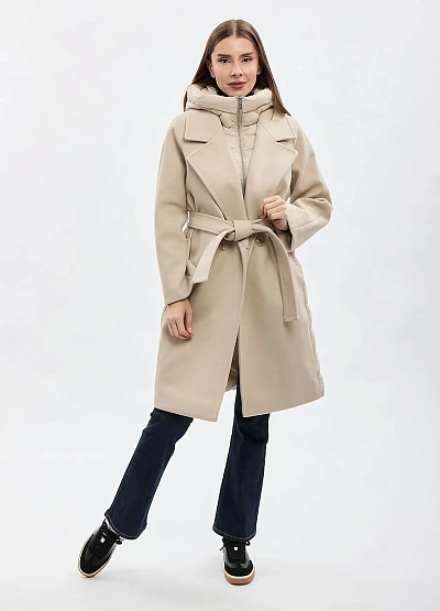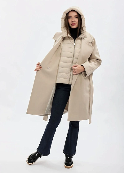 • Женское пальто комбинированного дизайна, сочетающее элегантность классического кроя и практичность утеплённой куртки. Модель выполнена в светлом бежевом оттенке и дополнена внутренней стёганой частью с высоким воротником, которая обеспечивает дополнительное тепло и комфорт в холодную погоду. Прямой силуэт с поясом подчёркивает фигуру, а лаконичные линии делают пальто универсальным решением для повседневного и городского гардероба. Модель гармонично сочетает стиль и функциональность, подходя для межсезонья и прохладной зимы.