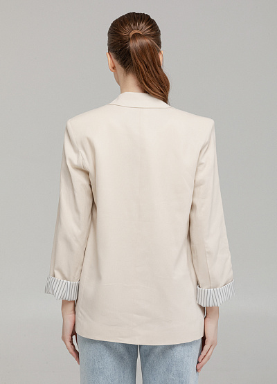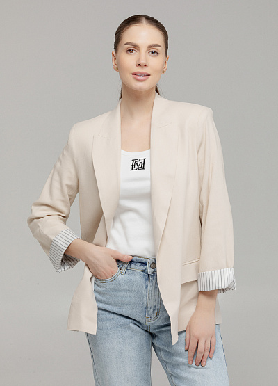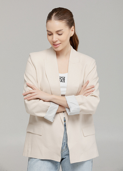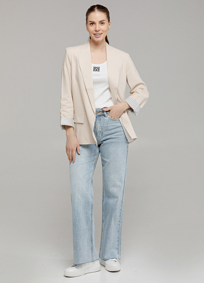 • Женский жакет бежевого цвета — лёгкая альтернатива классическому пиджаку для тёплого сезона. Прямой силуэт, мягкие плечи и укороченные рукава создают расслабленный и современный образ.