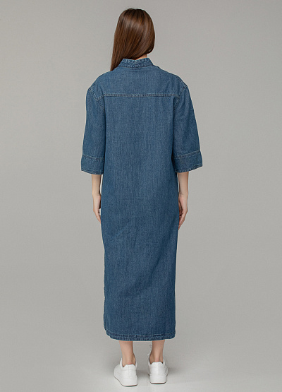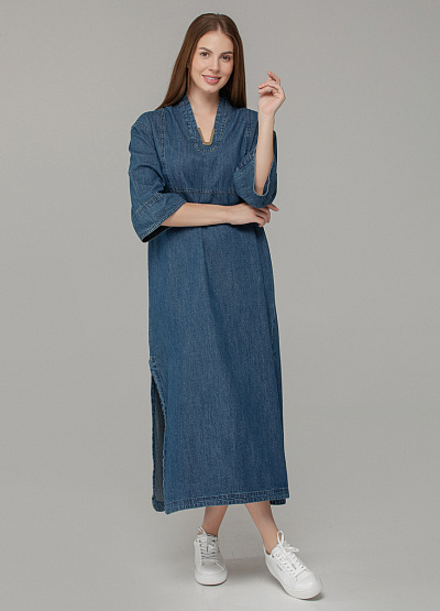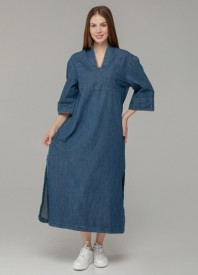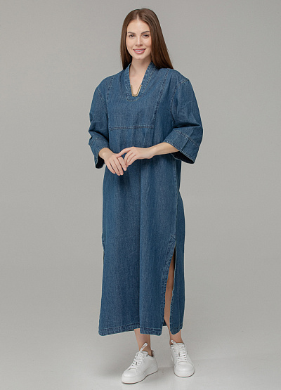 • Свободное джинсовое платье миди с разрезами по бокам — стильное и комфортное решение на каждый день. Модель выполнена из мягкого денима средней плотности, который держит форму, но не сковывает движений. Широкие рукава 3/4, V-образный вырез и лаконичный крой делают платье универсальным и современным.