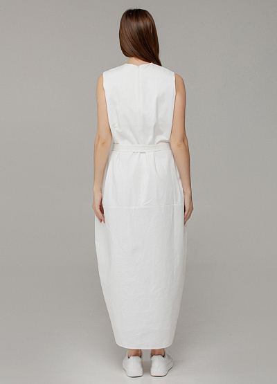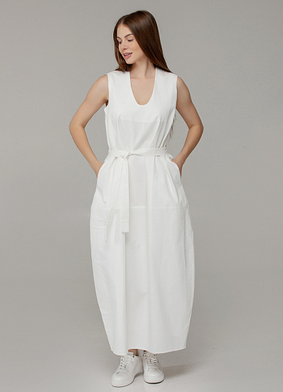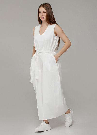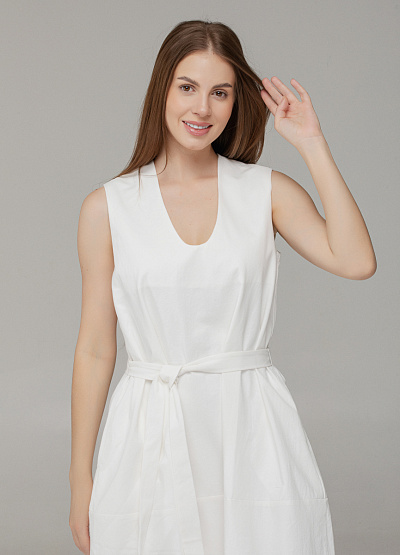 • Белое женское платье миди без рукавов — воплощение минимализма и свежести. Модель выполнена из лёгкой хлопковой ткани, идеально подходящей для тёплого сезона. Прямой крой с поясом на талии позволяет адаптировать силуэт под любую фигуру, создавая изящный и современный образ.