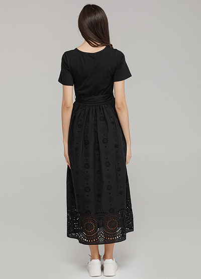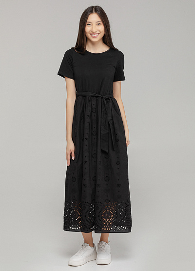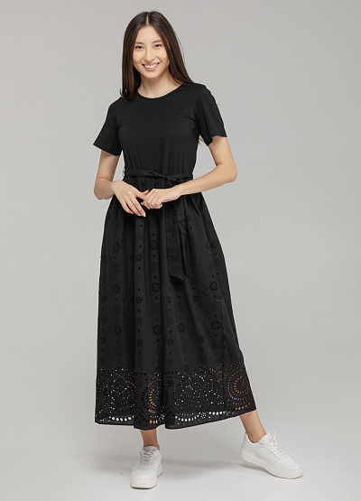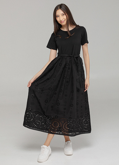 • Женское чёрное платье в стиле casual с вышитым низом — удачное сочетание практичности и акцента на детали. Верхняя часть выполнена из мягкого трикотажа, а юбка из хлопковой ткани украшена ажурной вышивкой и дополнена поясом.