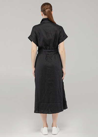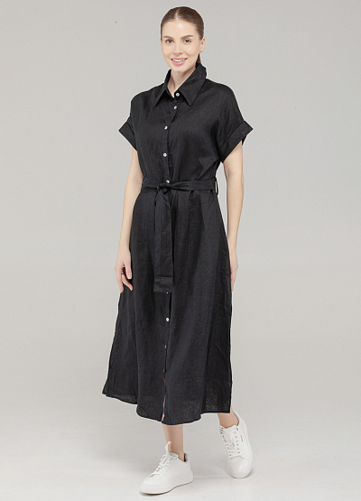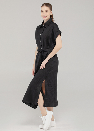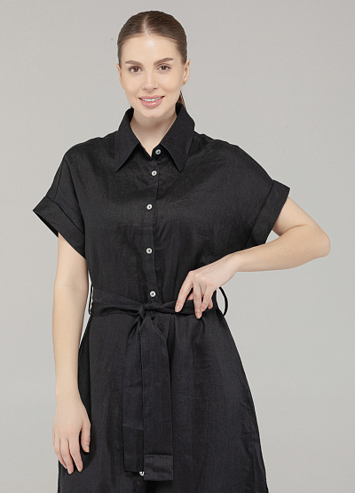 • Платье-рубашка — воплощение минималистичного летнего стиля. Выполнено из чистого льна, оно отлично дышит и дарит ощущение лёгкости в жаркие дни. Чёрный цвет делает образ строгим, но универсальным: подойдёт как для офиса, так и для прогулки по городу. Прямой силуэт с поясом подчёркивает фигуру, а аккуратный воротник добавляет изысканности. Это платье — база, которая легко впишется в любой гардероб.
