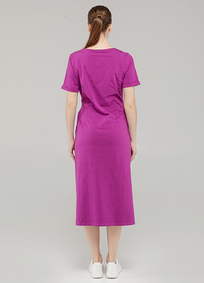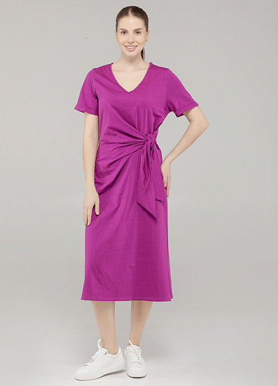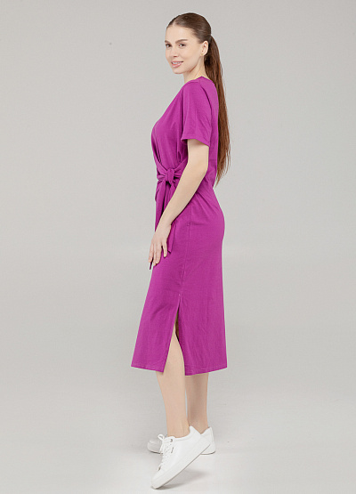 • Свободное хлопковое платье насыщенного оттенка фуксии — идеальный вариант для тёплых дней. Лёгкая ткань обеспечивает комфорт, а декоративный узел на талии подчёркивает фигуру и добавляет изюминку в образ. Сочетается с кедами, сандалиями или мюлями — универсальный выбор для прогулок, встреч или расслабленных выходов.