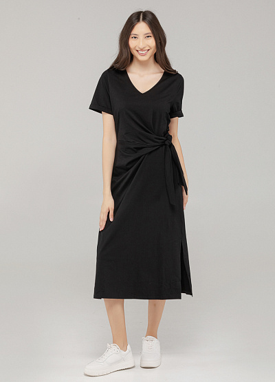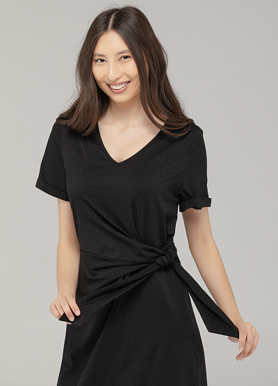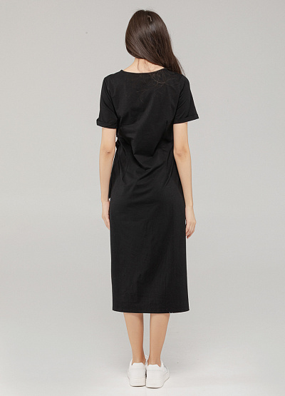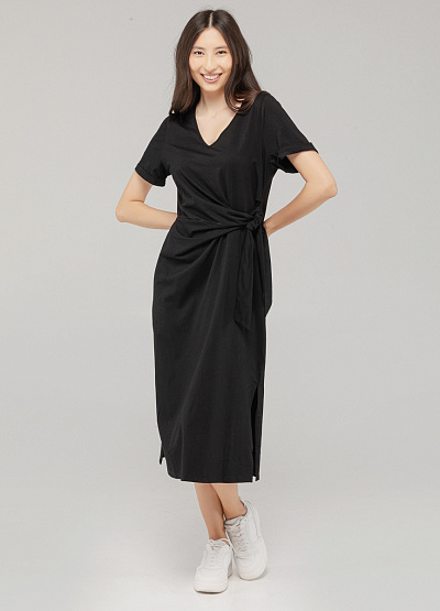• Лаконичное чёрное платье из мягкого хлопка — универсальный вариант на каждый день. Благодаря свободному крою и завязке на талии модель подчёркивает фигуру, сохраняя при этом комфорт. Чёрный цвет легко комбинируется с любой обувью и аксессуарами, позволяя создавать и расслабленные, и более собранные образы.
