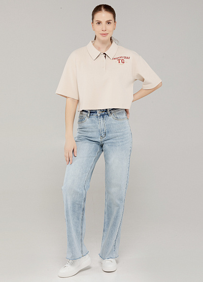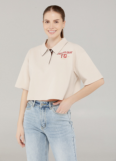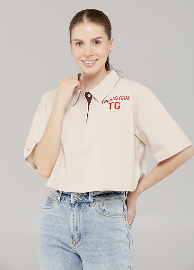 • Современное прочтение классики — женское поло в стиле ретро-спорт с модным укороченным кроем. Модель выполнена в светло-бежевом оттенке с контрастной вышивкой THOMAS GRAF TG Team на груди, что добавляет изюминку и актуальность повседневному образу. Изготовленное из дышащей текстурированной ткани, это поло сочетает в себе комфорт и стиль. Прямой свободный силуэт не сковывает движений, а укороченная длина подчеркивает линию талии и визуально вытягивает силуэт.