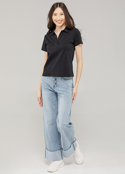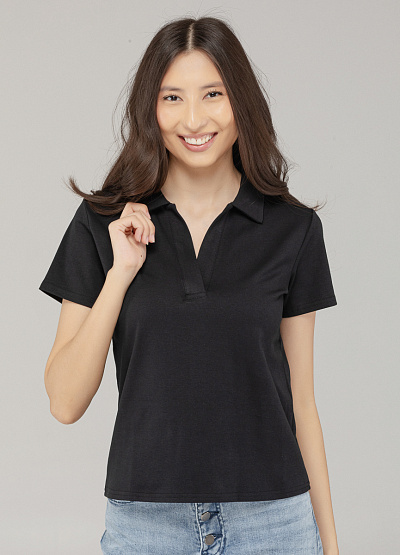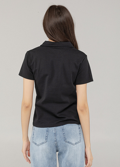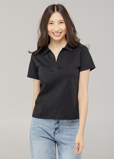 • Эта чёрная футболка-поло — находка для тех, кто ценит сдержанный стиль и комфорт. Модель без пуговиц с элегантным воротником смотрится лаконично, но при этом добавляет образу структуры. Идеально сочетается с джинсами, брюками и юбками, подойдёт как для активного дня, так и для расслабленного вечера.