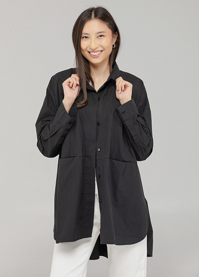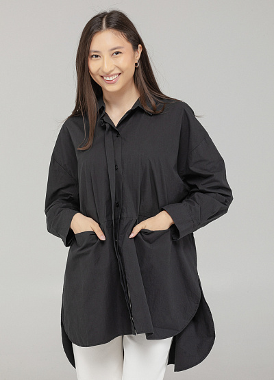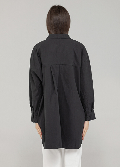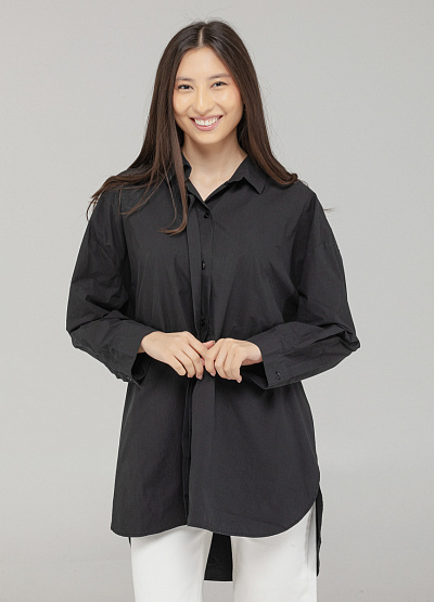 • Женская рубашка oversize в классическом чёрном цвете — базовый элемент гардероба с акцентом на комфорт и универсальность. Лёгкая ткань и свободный крой делают её идеальной для повседневных и деловых образов.
