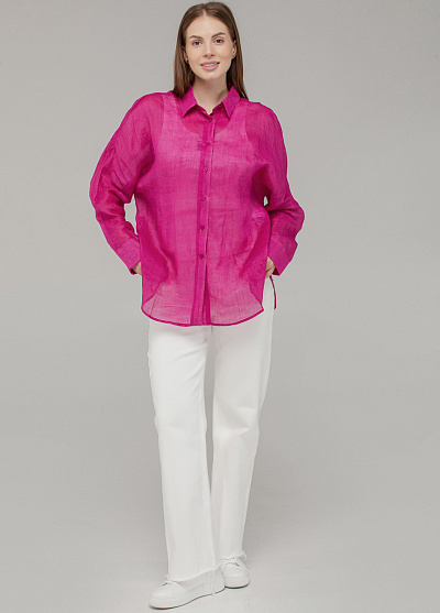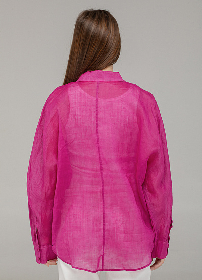 • Женская рубашка свободного кроя из лёгкого полупрозрачного материала в насыщенном малиновом оттенке — смелое решение для летнего гардероба. Воздушная текстура ткани подчёркивает лёгкость образа, а свободный силуэт и длинные рукава добавляют комфорта в жаркие дни.