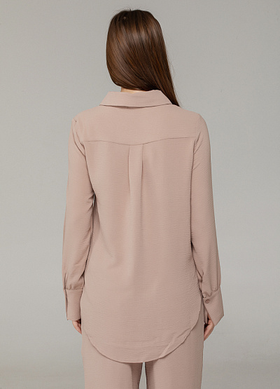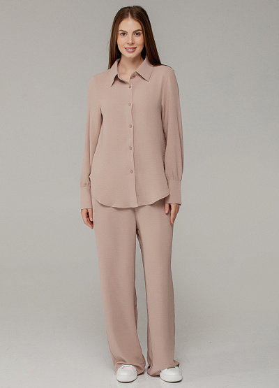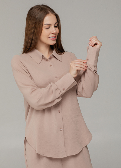 • Женская рубашка в мягком пудровом оттенке — воплощение утончённого минимализма и комфорта. Выполнена из лёгкой ткани с деликатной текстурой, модель отличается прямым свободным кроем и застёжкой на пуговицы. Идеально сочетается как с однотонными низами, так и с брюками из комплекта.