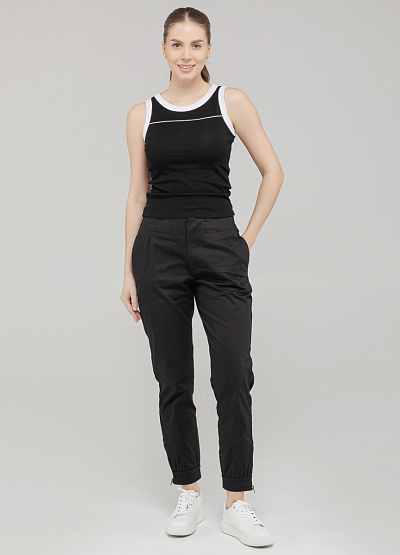 • Женская майка в спортивном стиле с контрастной отделкой — практичный и стильный элемент базового гардероба. Чёрный цвет в сочетании с белыми вставками подчёркивает фигуру и добавляет образу динамики.