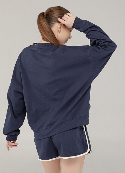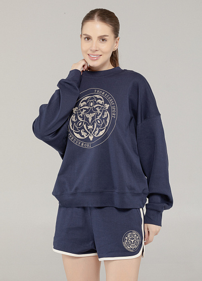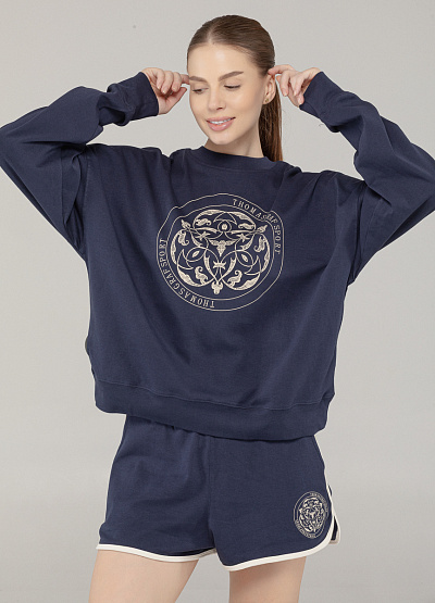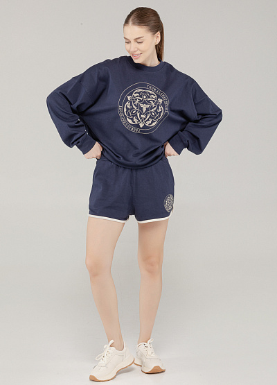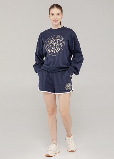 • Оригинальный спортивный комплект в насыщенном тёмно-синем цвете — идеальный выбор для тех, кто сочетает стиль и комфорт. Удлинённый свитшот с фирменным принтом и мягкие шорты с контрастной окантовкой создают гармоничный образ для отдыха, спорта или прогулок.