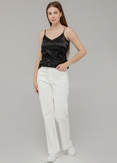 • Женственный топ на тонких бретелях из атласной ткани — базовая вещь с элегантным акцентом. Глубокий чёрный цвет, мягкий сатиновый блеск и V-образный вырез с полупрозрачной вставкой делают модель универсальной как для дневных, так и вечерних образов.