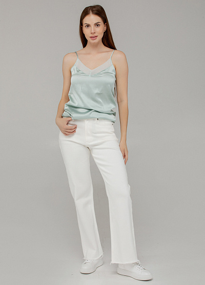 • Женственный топ на тонких бретелях из атласной ткани — базовая вещь с элегантным акцентом. Мятный цвет, мягкий сатиновый блеск и V-образный вырез с полупрозрачной вставкой делают модель универсальной как для дневных, так и вечерних образов.