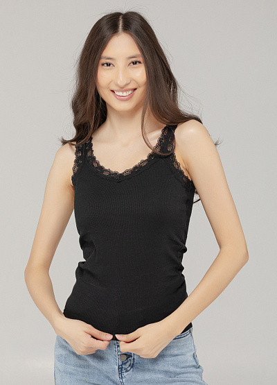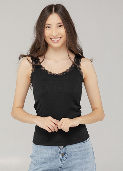 • Черная майка с кружевной отделкой — идеальный выбор для тех, кто ценит баланс между комфортом и женственностью. Модель выполнена из мягкого эластичного трикотажа в рубчик, который плотно прилегает к телу, создавая красивый силуэт. Кружевная отделка по вырезу и бретелям добавляет образу деликатный акцент, делая вещь подходящей как для повседневной носки, так и для особых случаев.