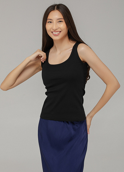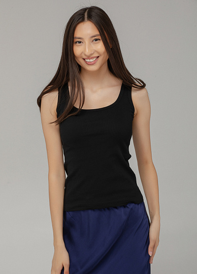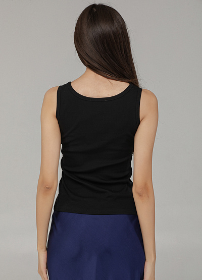 • Базовый чёрный топ без рукавов — незаменимая вещь в любом гардеробе. Модель выполнена из мягкого трикотажа с лёгкой текстурой в рубчик, благодаря чему хорошо тянется и комфортно сидит по фигуре. Классический круглый вырез и лаконичный крой делают топ универсальным решением для многослойных и летних образов.