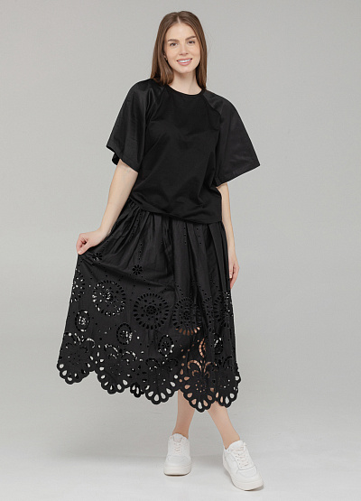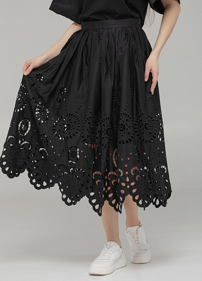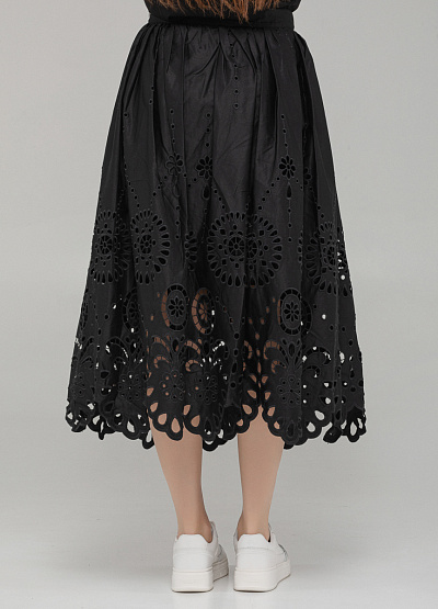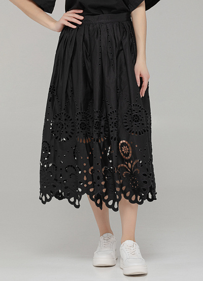 • Элегантная черная юбка миди длины выполнена из хлопковой ткани с ажурной вышивкой и декоративной перфорацией. Модель отличается романтичным и женственным дизайном, подчёркивающим лёгкость и свежесть летнего образа. Расклешённый силуэт и высокая посадка визуально вытягивают фигуру, а широкая резинка на талии обеспечивает комфортную посадку. Низ юбки оформлен фигурным краем, дополненным цветочным узором.