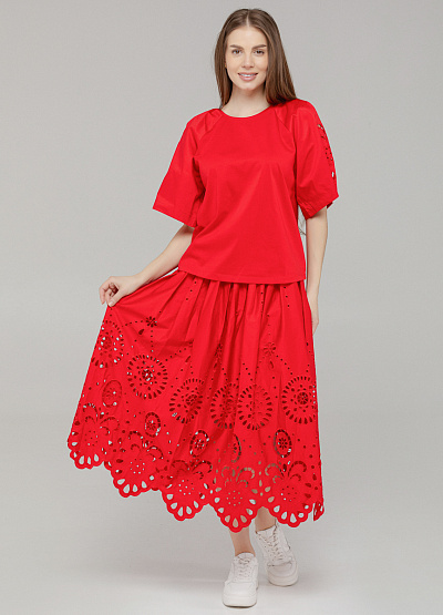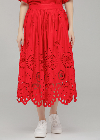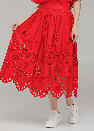 • Элегантная красная юбка миди длины выполнена из хлопковой ткани с ажурной вышивкой и декоративной перфорацией. Модель отличается романтичным и женственным дизайном, подчёркивающим лёгкость и свежесть летнего образа. Расклешённый силуэт и высокая посадка визуально вытягивают фигуру, а широкая резинка на талии обеспечивает комфортную посадку. Низ юбки оформлен фигурным краем, дополненным цветочным узором.