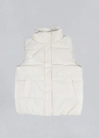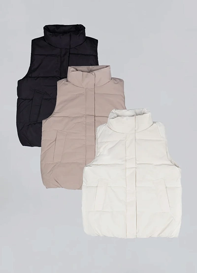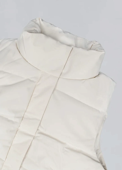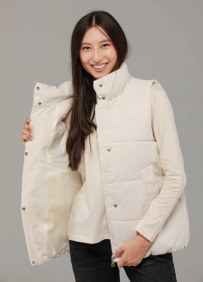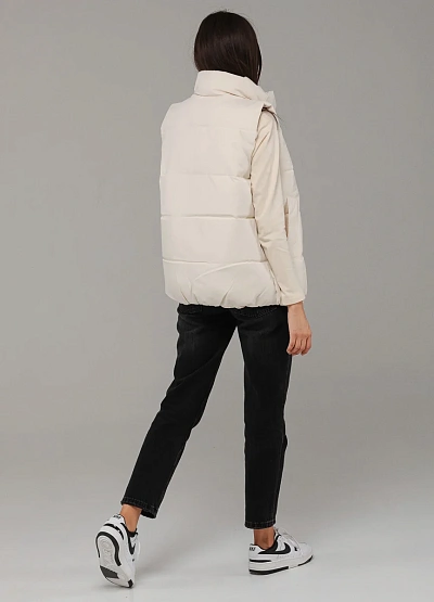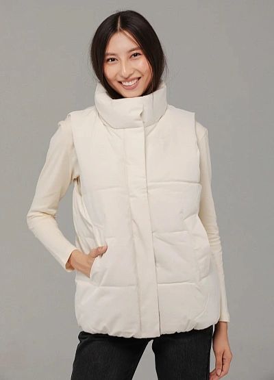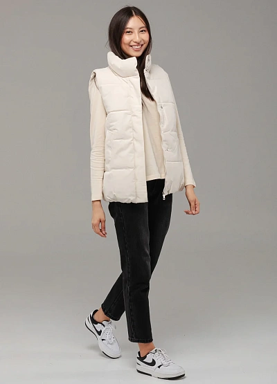 Тёплый жилет с высоким воротником защитит от ветра и подарит комфорт в прохладные дни. Базовый светлый оттенок идеально сочетается с джинсами, брюками или спортивной одеждой.