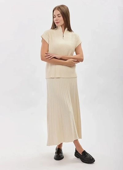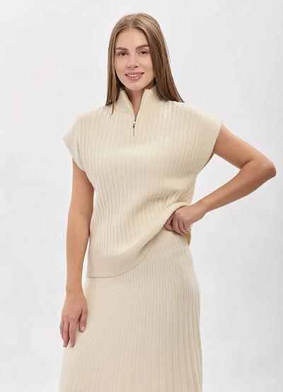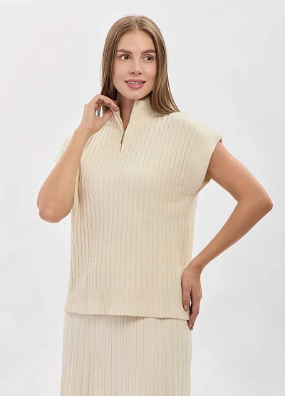 • Элегантный трикотажный жилет в молочном оттенке — универсальная модель для утончённых и современных образов. Вертикальная фактурная вязка визуально вытягивает силуэт, а аккуратный воротник-стойка с молнией добавляет образу аккуратный акцент. Свободный крой и отсутствие рукавов делают модель идеальной для многослойных сочетаний в любое время года.